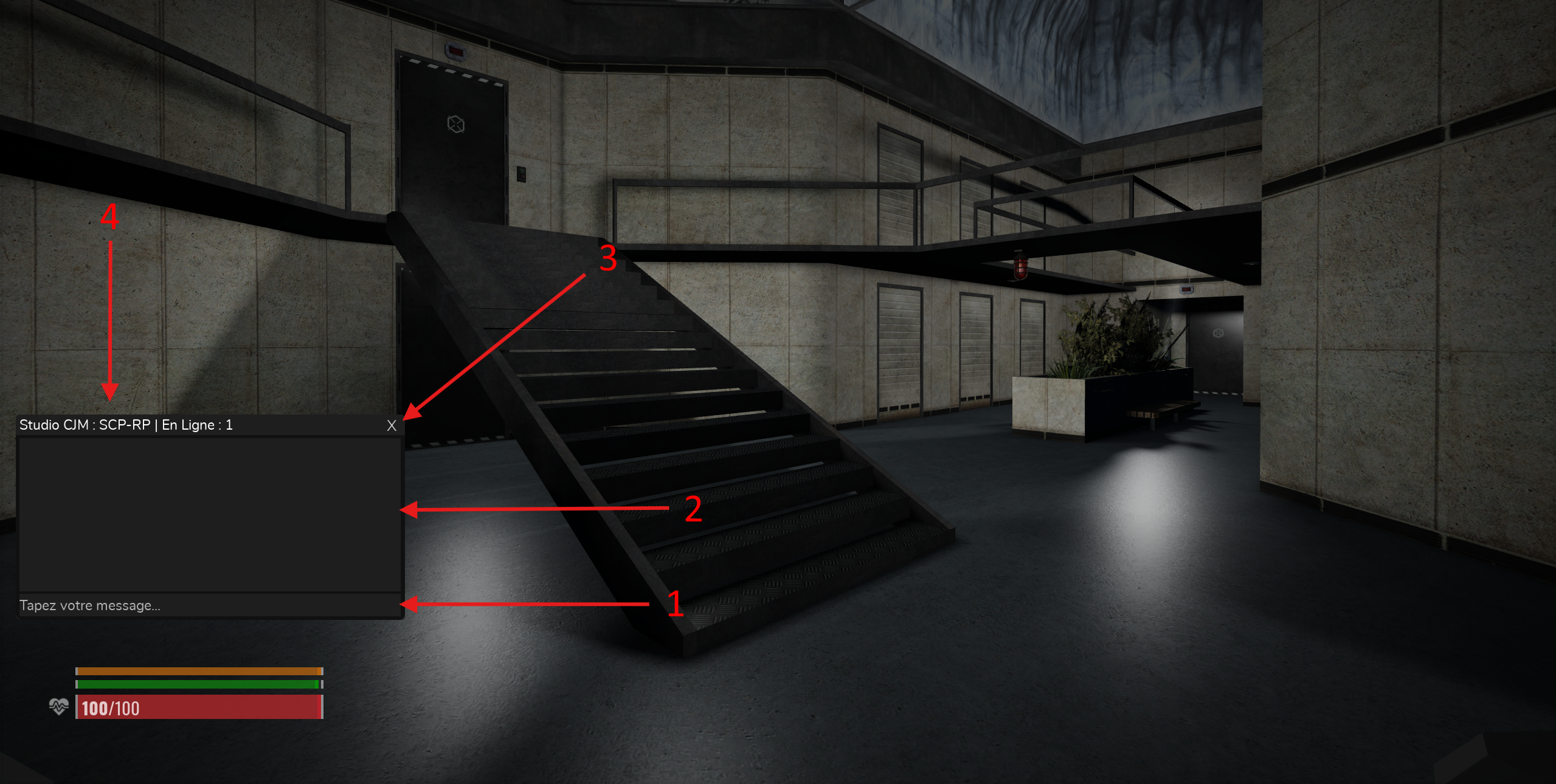 Une fois votre message saisit, appuyez sur la touche Entrée de votre clavier pour l'envoyer. Votre message sera envoyé aux personnes autour de vous en RP. Le chat sera fermé automatiquement à l'envoi du message, si vous voulez fermer le chat, envoyez un message vide ou bien utilisez la croix pour le fermer (3).